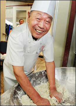 김씨는 이날 주방에서 직접 메밀가루 반죽을 했다. 제자가 김이 올라오는 더운 물을 담아오자, 고개를 젓더니 찬 물을 떠오라고 시켰다. "날씨가 더우면 면이 잘 풀어지기 때문에 찬 물로 반죽하는 거예요. 여름에는 메밀 함량을 낮추고 삶는 시간도 줄여요. 반면 겨울에는 삶는 시간을 늘리고, 메밀 함량도 높이지. 겨울철 메밀은 갓 수확해 맛이 좋거든."